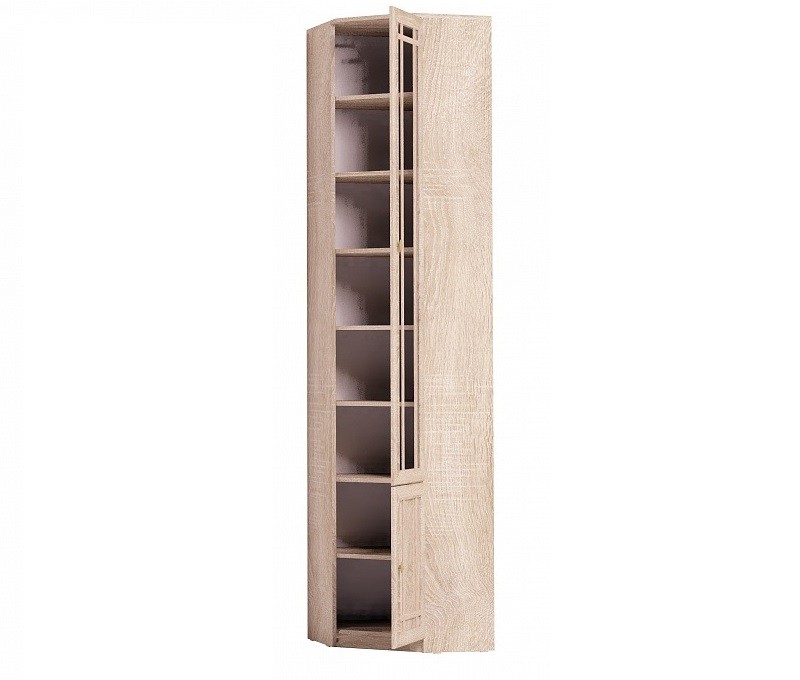 Угловой книжный шкаф - практичное решение для малогабаритных гостиных, библиотек или рабочих кабинетов, где каждый свободный сантиметр важно использовать рационально. Конструкция и габариты шкафа позволят Вам организовать полноценную зону для бережного хранения литературы и сопутствующих вещей. Модуль возможно установить в комнате, высота полотка которой не менее 240 см. Наполнение - комплект регулируемых по высоте полок. Фасад шкафа декорирован тонированным стеклом, свойства которого защитят Ваши книги от вредного воздействия лучей света и загрязнений. Шкаф для книг Sherlock 33 обязательнокрепится к стене за подвесы и межсекционной стяжкой с другими шкафами в комплекте. Особенности ЛДСП 16 мм, кромка ПВХ рамочные фасады из профиля МДФ тонированное стекло 4 мм декор "дуб сонома" комплект регулируемых по высоте полок обязательное крепление к стене за подвесы