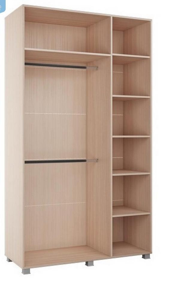 • Шкаф трёхстворчатый состоит из секции с полками (шириной 1/3 шкафа) и секцией с полкой и 2мя штангами (шириной 2/3 шкафа), данные секции универсальные, могут располагаться с любой стороны, для этого необходимо выбрать расположение отверстий под перегородку на верхней и нижней крышке.